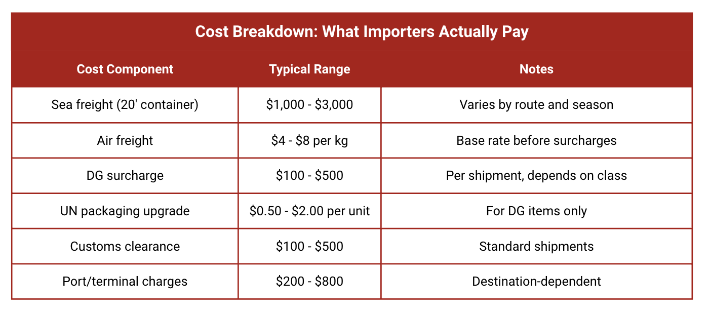Packaging upgrades – additional $0.50–$2.00 per unit for UN-certified DG packaging