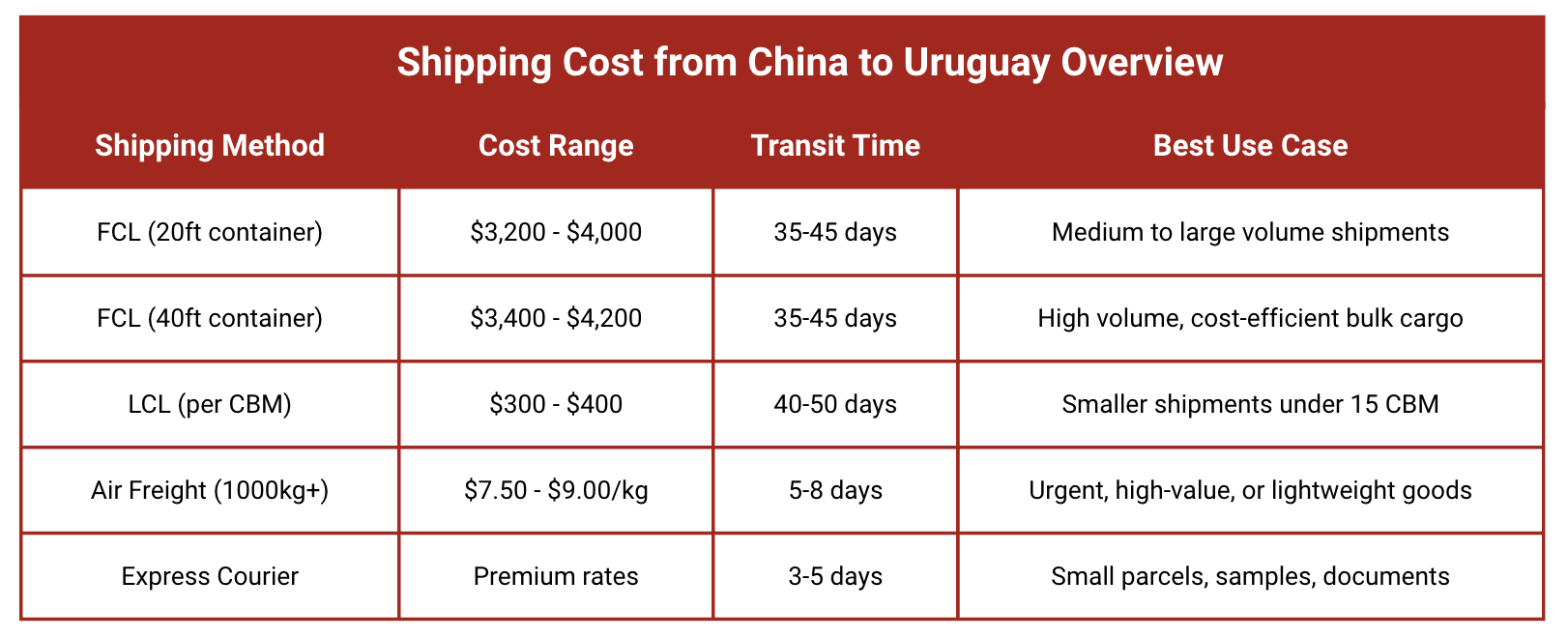 Shipping costs from China to Uruguay vary based on fuel prices, seasonal demand, and global logistics conditions. The following sections provide current rate ranges and cost structures for different shipping methods.