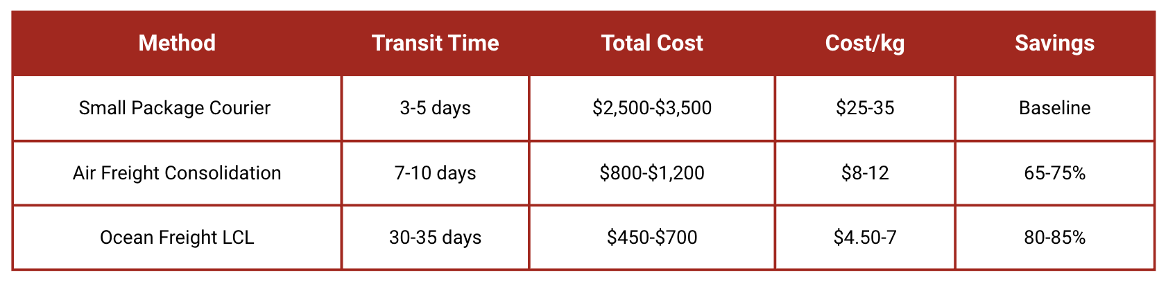 Dramatically lower cost per kilogram: Ocean LCL typically costs $2-6 perkg, air freight consolidation runs $6-12 perkg, compared to $15-40 perkg for small package couriers