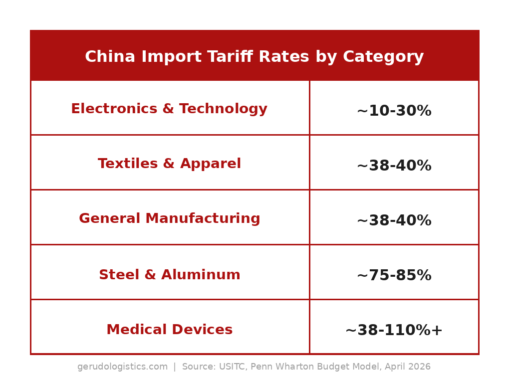 A: As of Q2 2026, Chinese goods face an effective tariff rate of approximately 31-32% on a weighted basis (Penn Wharton Budget Model, February 2026 USITC data). Electronics with Section 122 exemptions may face as low as 7.5-10%, while general manufacturing runs 38-40% and steel/aluminum 75-85%.