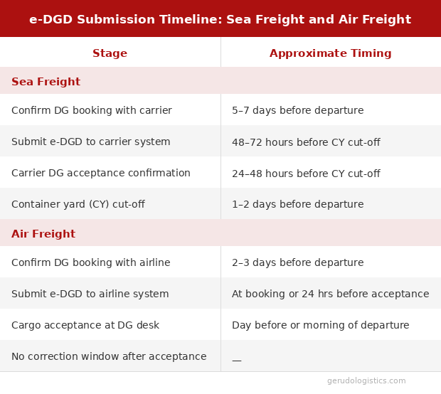 With paper DGDs, suppliers could sometimes finalise the document on cargo delivery day. The e-DGD submission window closes earlier. The document must be submitted and approved through the carrier's digital system before cargo reaches the terminal.