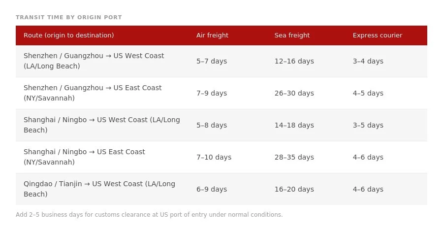 Transit times vary by origin port, destination, and season. The figures below reflect standard conditions without customs examination delays.