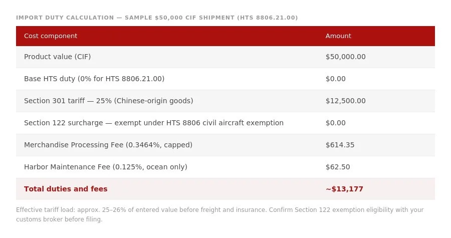 The Section 122 global surcharge (10% to 15%, introduced February 24, 2026) includes a civil aircraft exemption in its Annex II list. Drones classified under HTS 8806 generally qualify for this exemption.