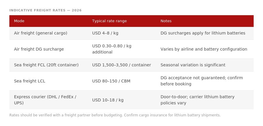 Air freight suits orders under approximately 500 kg volumetric weight or time-sensitive shipments. Lithium battery restrictions under IATA are strict, particularly for spare batteries shipped separately. Confirm DG acceptance with the airline before booking.