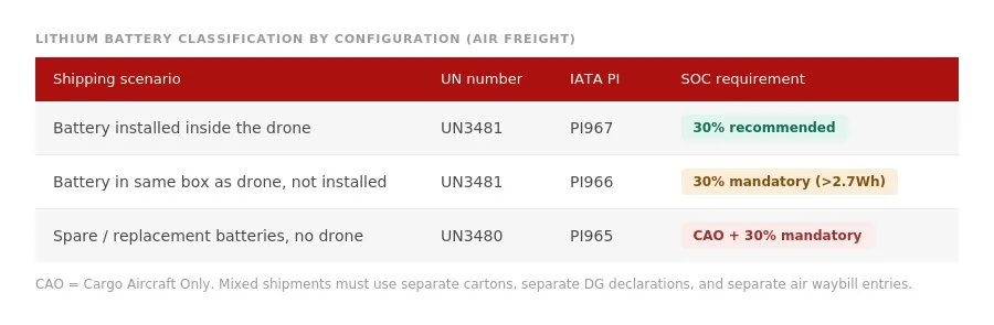 Drone batteries are classified as dangerous goods under both air and sea regulations. The classification that applies depends on how the battery is configured relative to the drone. Getting this wrong results in carrier rejection at origin.