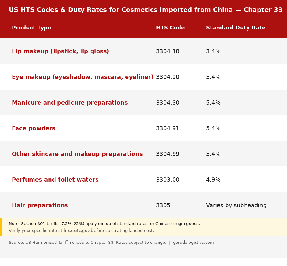 Cosmetics from China are classified under Chapter 33 of the Harmonized Tariff Schedule. Standard duty rates are low, but Section 301 tariffs add significantly to the total. Most cosmetics under Chapter 33 face an additional 7.5% to 25% in Section 301 tariffs on top of the base rate.