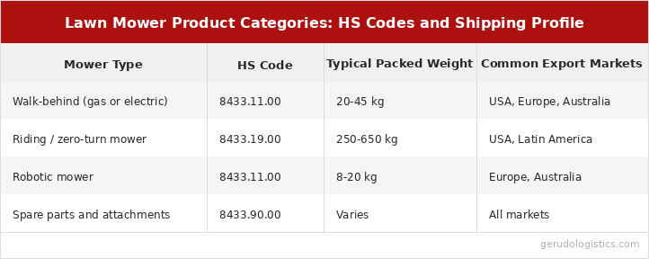 Walk-behind mowers use HS 8433.11.00 and riding mowers use HS 8433.19.00. Spare parts and accessories classify under 8433.90.00. Confirm the correct classification with your customs broker before shipment, as misclassification affects applicable duty rates and may trigger compliance reviews.